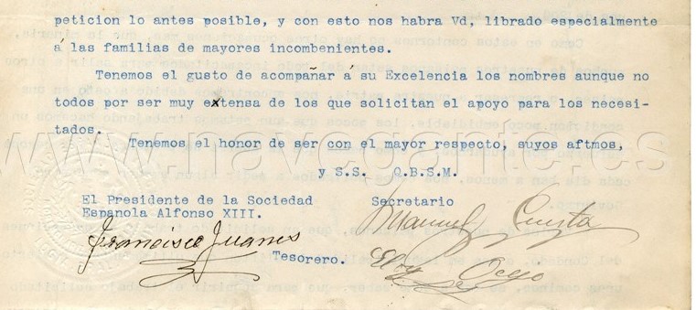 Firman este escrito El Presidente de la Sociedad Española Alfonso XII Francisco Juanes, el Secretario Manuel Cuesta y el Tesorero Eloy Ocejo
