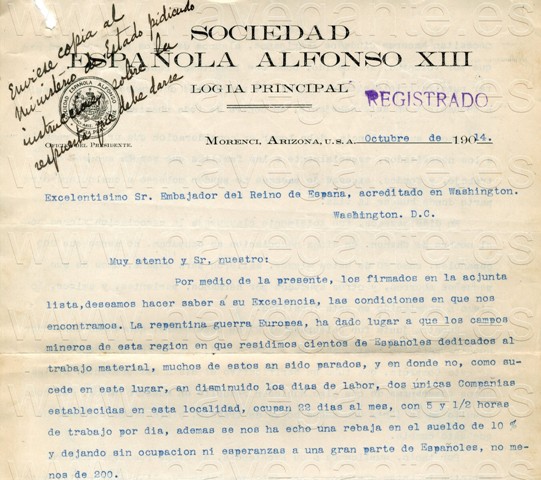La SOCIEDAD ESPAÑOLA ALFONSO XIII, en Morenci, Arizona, dirige al Embajador de España en Washington una carta solicitando ayuda para los españoles allí radicados. La I guerra mundial se ha desatado ya con efectos devastadores para los emigrantes españoles, cántabros especialmente, mineros casi todos en el territorio de Arizona.