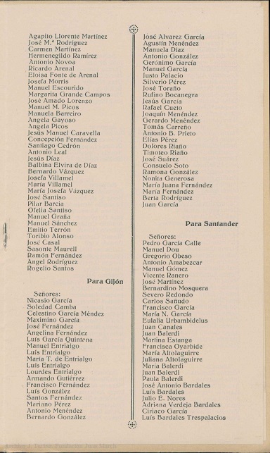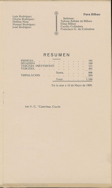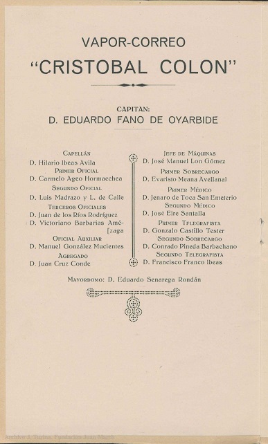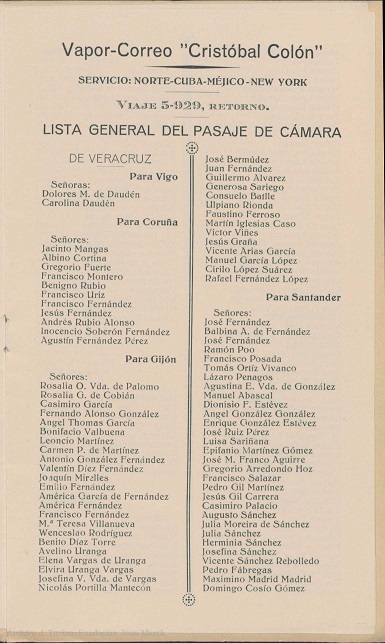 La Compañía Trasatlántica Española editaba para cada travesía un folleto con la relación de tripulantes y pasajeros embarcados. Mostramos el que publicó el 12 de mayo de 1929 para el viaje que el vapor Cristóbal Colón realizó desde Veracruz, Habana y Nueva York a los puertos del norte de España Coruña, Gijón, Santander y Bilbao. El acontecimiento social que suponía el viaje con varias semanas de travesía hacía que este fuera un hecho relevante e inolvidable en la vida de sus protagonistas.