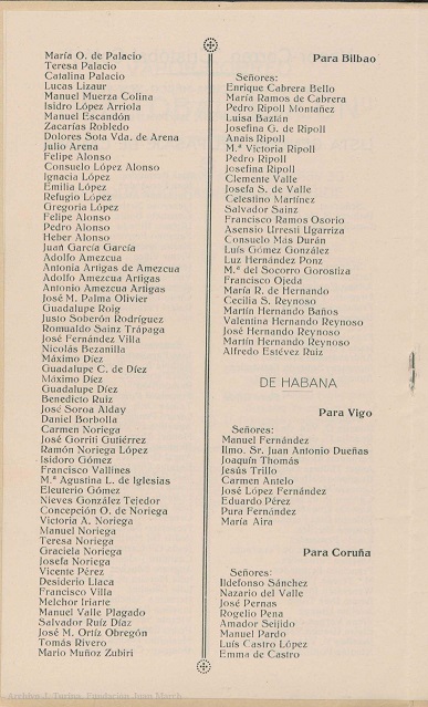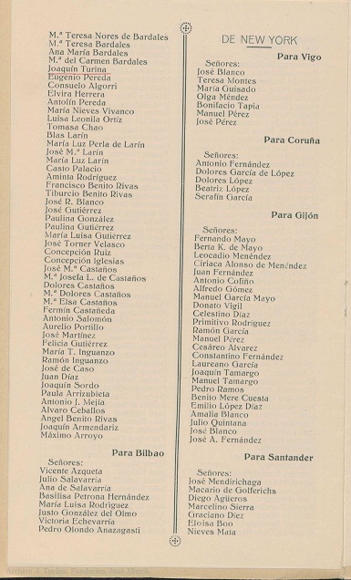 Entre el pasaje encontramos al músico y compositor Joaquín Turina que había ido a dar unas conferencias a New York meses antes de que se desplomara la bolsa. Este es su folleto del viaje de regreso y forma parte del fondo Joaquín Turina que custodia la Fundación Juan March